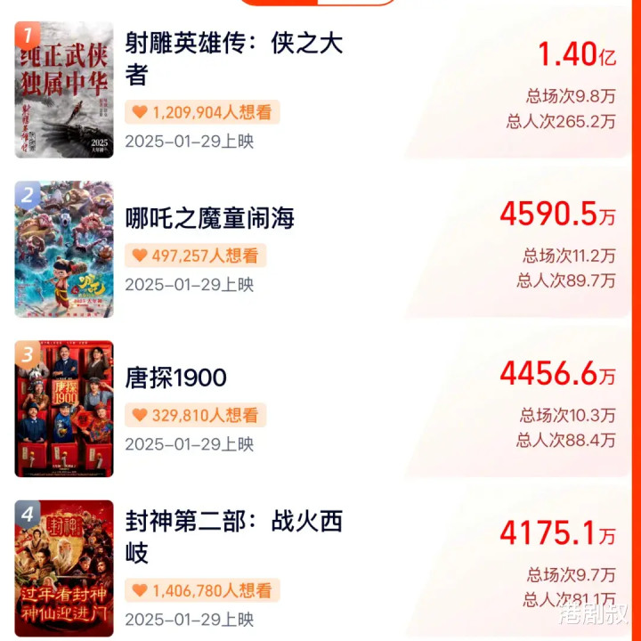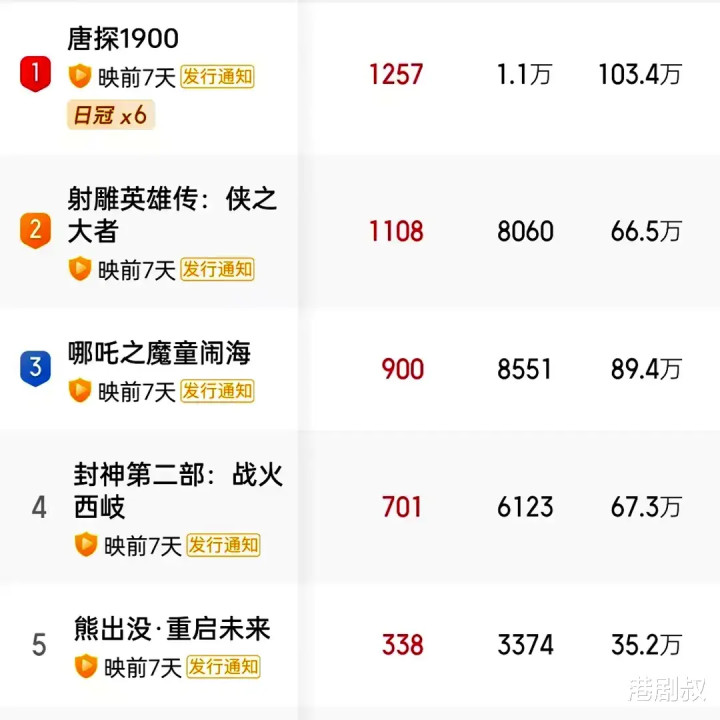 如果有人请港剧叔免费看电影,港剧叔首选唐探,其次射雕,哪吒和封神略过。另外,如果孩子想看熊出没,也得带孩子去看,哈哈哈哈。不说了,上数据。
